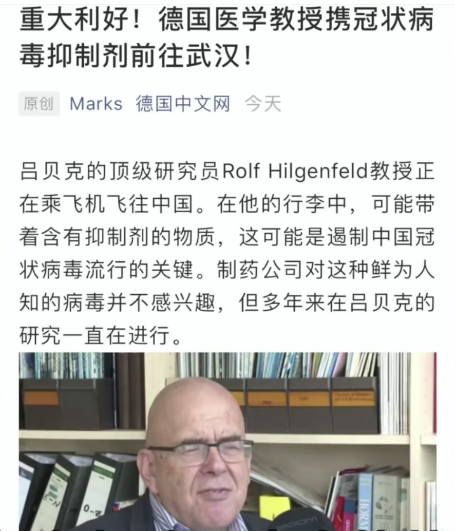 早在22号新闻就说有位来自德国吕贝克大学的冠状病毒研究专家带着抑制病毒的药来华帮忙了。当时看到这条新闻感觉到一丝欣慰。