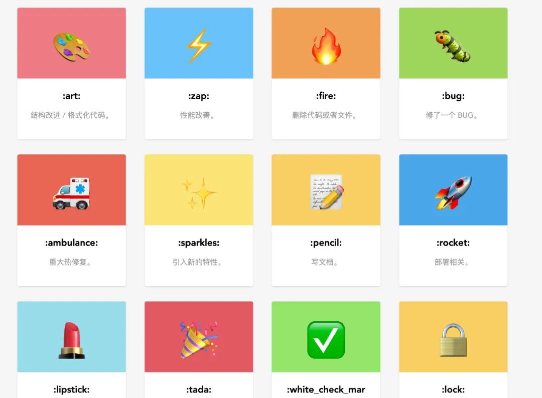 在执行 git commit 指令时使用 emoji图标为本次提交添加一个特别的图标, 这个本次提交的记录很容易突出重点,或者说光看图标就知道本次提交的目的。这样就方便在日后查看历史提交日子记录中快速的查找到对于的提交版本。由于有很多不同的表情符号,表情库更新后,没有一个可以帮助更轻松地使用表情符号的中文表情库列表。所以这里主要列出 gitmoji项目中规定的emoji规范的表情符号列表。